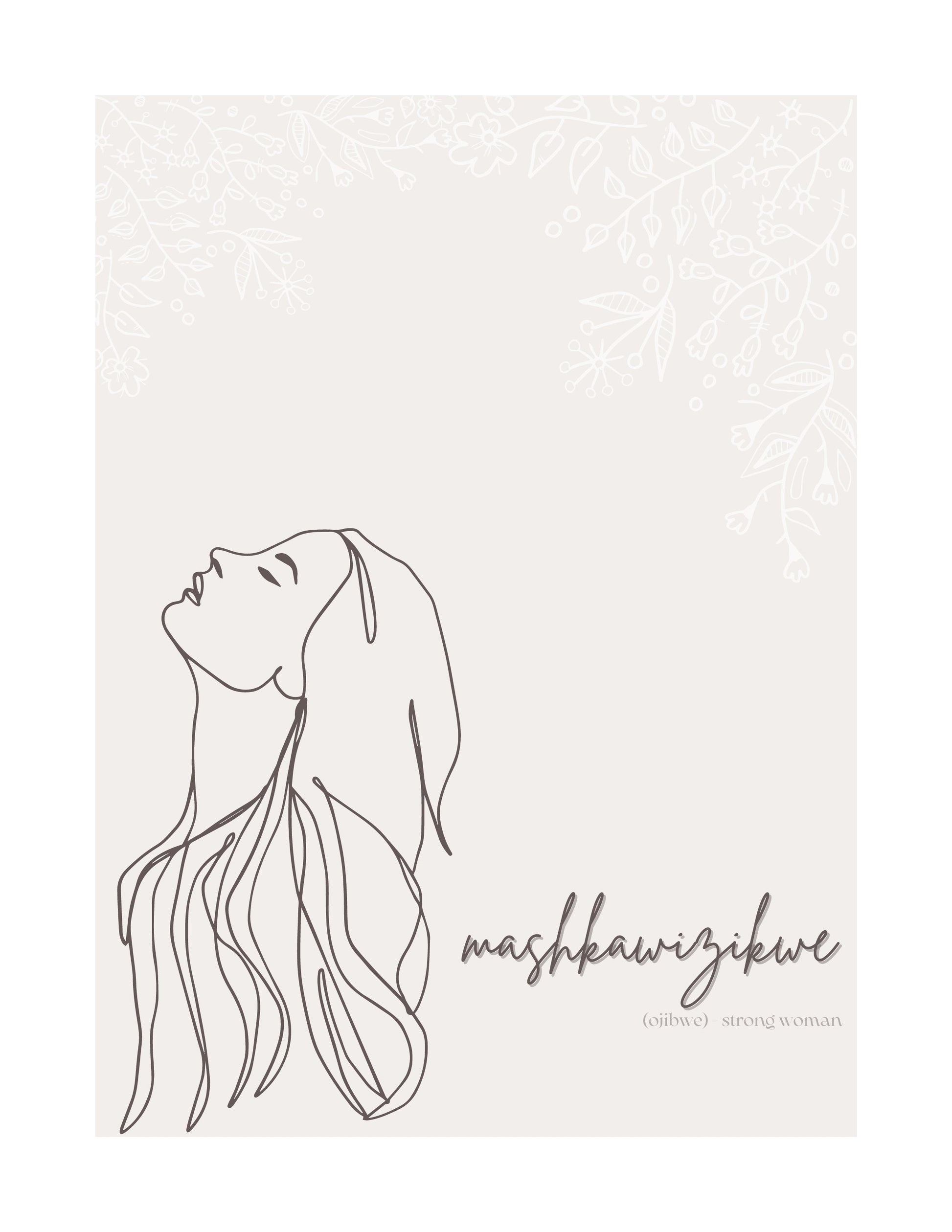 This print honours the strong women in our lives that have shaped us into who we are today. Embellished with white Woodlands-style florals and cursive Ojibwe writing, this makes the perfect gift for the proud Indigenous woman in your life.