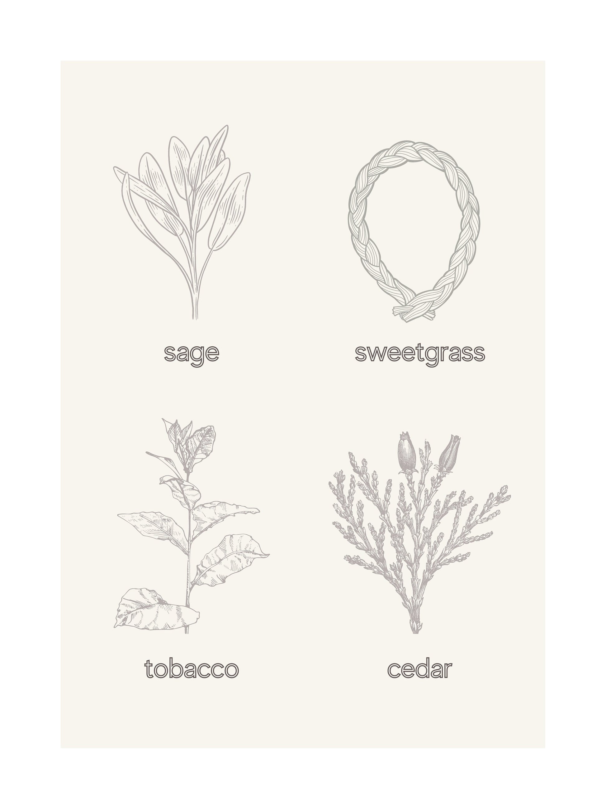 This culturally rich piece beautifully captures the essence of Indigenous wisdom through simple yet profound illustrations of the four sacred medicines: sage, sweetgrass, cedar, and tobacco.